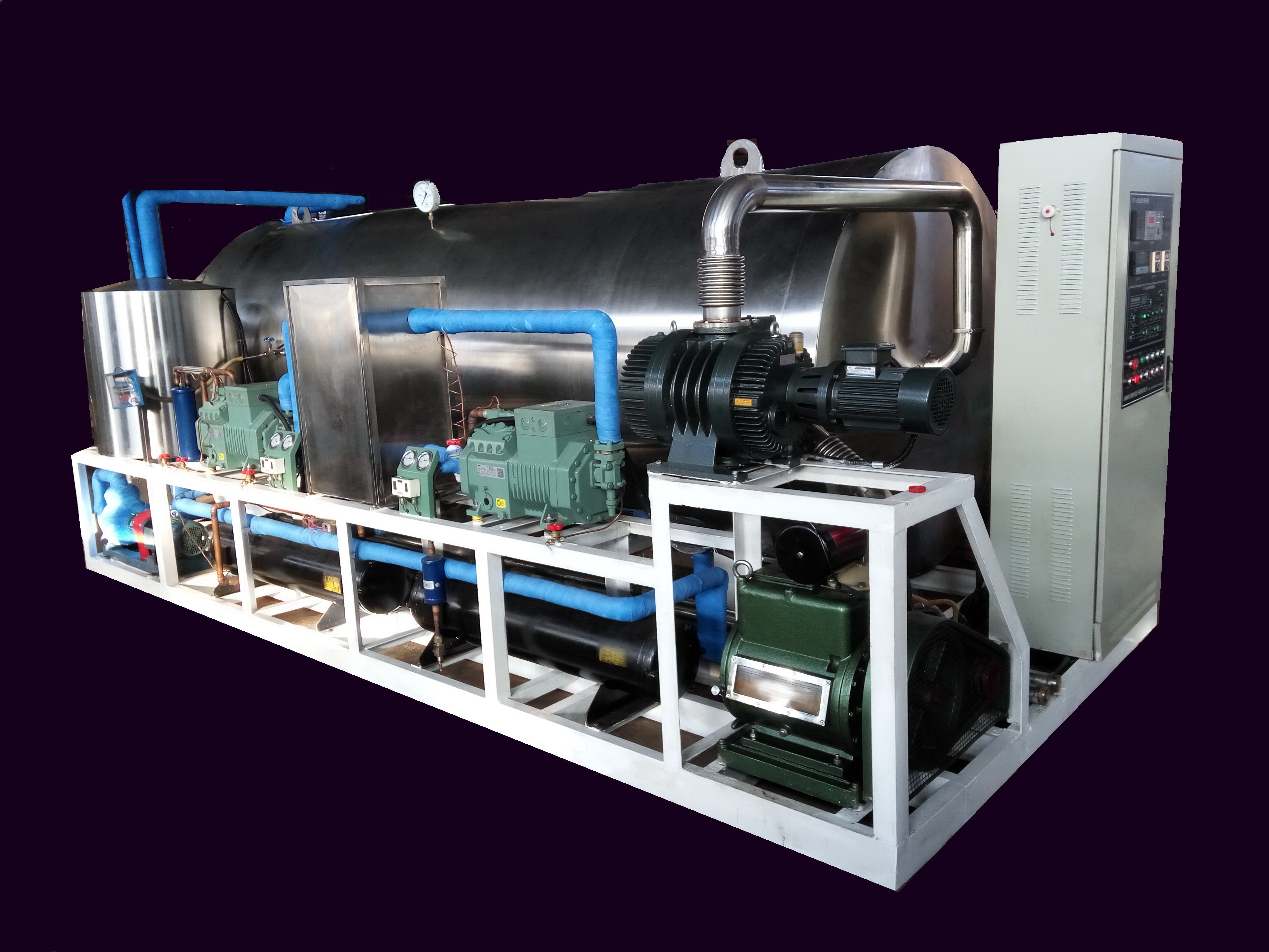 DT系列真空冷凍干燥機(jī)是利用升華原理將物料中的水預(yù)先凍結(jié)成冰以后在真空環(huán)境下脫除的一款干燥設(shè)備,區(qū)別于普通干燥設(shè)備的是經(jīng)該機(jī)脫水后的物料外形色澤和成分均可以保持原狀,組織多孔酥松,尤其粉體物料凍干后微觀松散而不結(jié)團(tuán),極易溶于水。因此該機(jī)被廣泛應(yīng)用于生物制品、中西藥品、藥用原料、各類濃縮液制粉、各類食品、超細(xì)微粉、催化劑、石墨烯等材料制備等各個(gè)行業(yè)。我國真空冷凍干燥機(jī)從20年前依賴進(jìn)口到現(xiàn)在完全國產(chǎn)化,走過了漫長的發(fā)展歷程。本公司經(jīng)近20年的不斷努力創(chuàng)新,所生產(chǎn)的DT系列凍干設(shè)備從最原始簡陋的機(jī)型到現(xiàn)在集多項(xiàng)先進(jìn)技術(shù)于一身的現(xiàn)代機(jī)型,已經(jīng)有了質(zhì)的飛躍,主要經(jīng)濟(jì)技術(shù)指標(biāo)(包括干制品品質(zhì)、運(yùn)行穩(wěn)定性、使用壽命、節(jié)能降耗等)均已達(dá)到世界先進(jìn)水平。