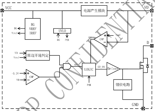 LP05R045T的內(nèi)部結(jié)構(gòu)框圖揭示了其高性能的秘密。芯片內(nèi)部集成了多個(gè)關(guān)鍵功能模塊,包括VCC供電技術(shù)、專利的整流管開通技術(shù)、欠壓保護(hù)、過壓鉗位以及驅(qū)動(dòng)腳去干擾技術(shù)等,這些模塊共同確保了芯片的高效運(yùn)行和穩(wěn)定輸出。