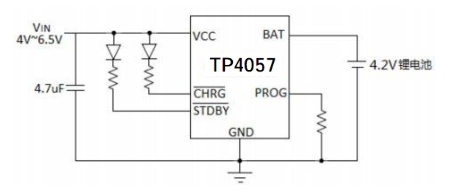 TP4057:輸入電壓范圍較寬,為4.5V至6V。這意味著它能夠適應更多種類的電源適配器,包括一些輸出電壓稍高的適配器,為設計提供了更大的靈活性。
