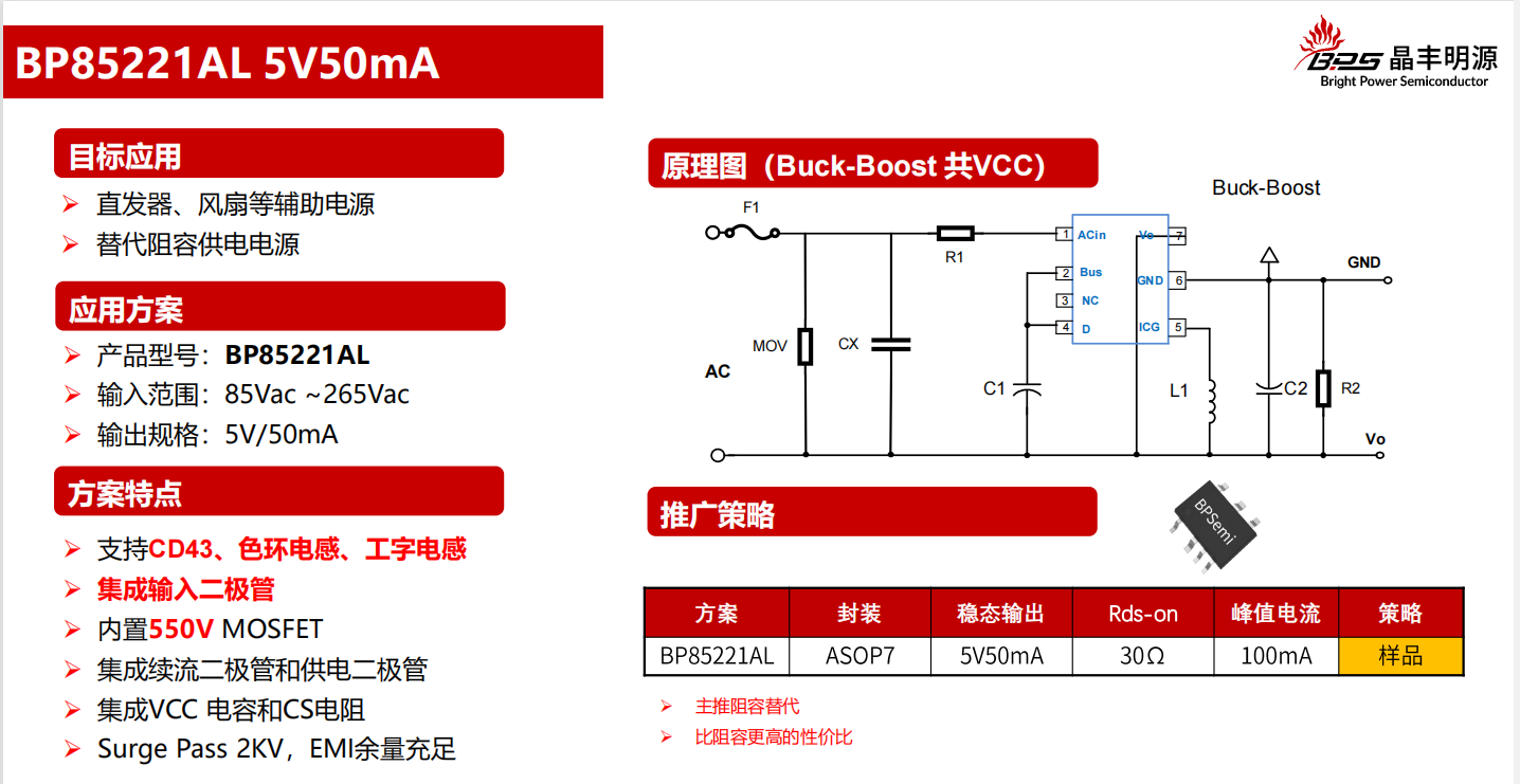 在電源設(shè)計(jì)領(lǐng)域,阻容降壓芯片因其簡單性和成本效益而被廣泛使用。然而,隨著電子設(shè)備對電源效率和穩(wěn)定性要求的提高,傳統(tǒng)的阻容降壓方案逐漸暴露出其局限性。BP85221AL,作為一款高效的降壓型開關(guān)穩(wěn)壓器,提供了一種完美的替代方案,以滿足現(xiàn)代電源設(shè)計(jì)的需求。本文將探討B(tài)P85221AL如何實(shí)現(xiàn)對阻容降壓芯片的完美替代,并分析其在電源設(shè)計(jì)中的優(yōu)勢。