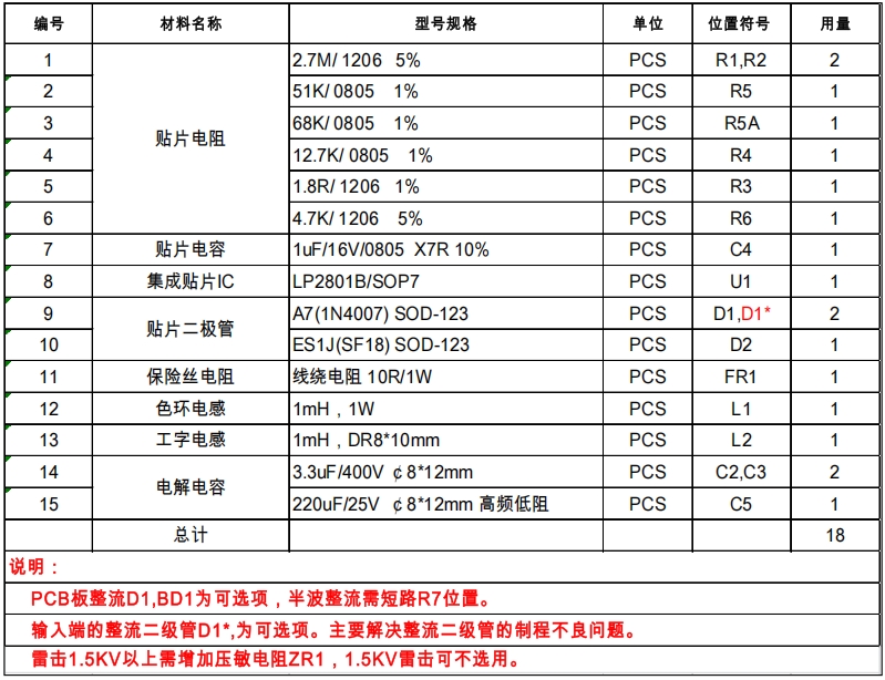 BOM表(物料清單)是實現(xiàn)LP2801B 12V150mA Buck設(shè)計的關(guān)鍵文件,它詳細(xì)列出了電路中所需的所有元件及其規(guī)格。以下是該設(shè)計的BOM表內(nèi)容:
