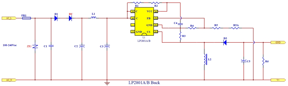 LP2801B 12V150mA Buck設(shè)計的原理圖是整個電源模塊設(shè)計的核心。其電路結(jié)構(gòu)主要包括以下幾個部分: