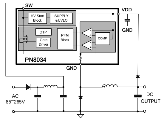 PN8034內(nèi)置高壓啟動模塊,能夠?qū)崿F(xiàn)系統(tǒng)快速啟動和超低待機功耗,待機功耗低于100mW。
