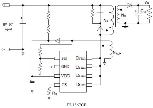 PL3367CE為小功率充電器/適配器應(yīng)用提供了高效的解決方案,其新穎的恒流/恒壓控制使得系統(tǒng)不需要次級(jí)反饋電路,并能實(shí)現(xiàn)高精度的恒流/恒壓輸出,從而滿足更嚴(yán)格的能源損耗要求。