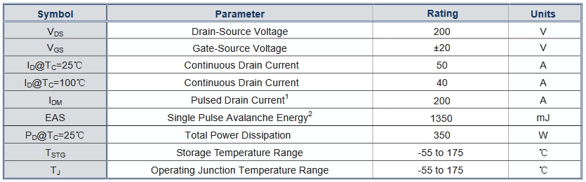 漏源電壓(VDS):最高可達200V,這意味著該MOSFET能夠承受較高的電壓,適用于高電壓環境下的應用。