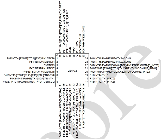 AiP8F3532 提供了多種封裝形式,包括 SOP32、SOP28、LQFP32 和 QFN32 等,以滿足不同用戶的需求。以下是其中幾種封裝形式的引腳排列圖: