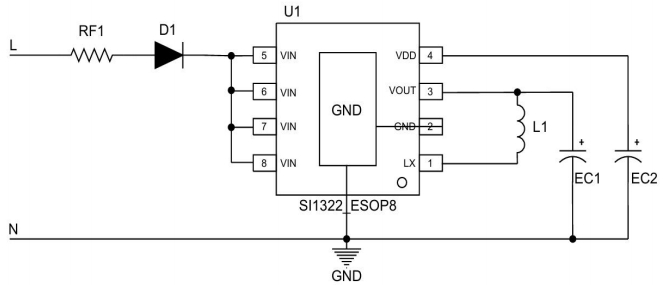SI1322 的典型應(yīng)用電路簡潔明了,易于理解和實現(xiàn)。
