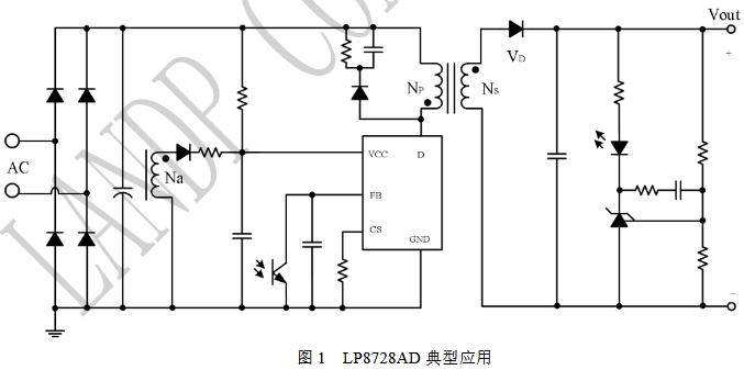 LP8728AD的典型應(yīng)用電路如下圖所示。在該電路中,AC輸入電壓通過變壓器的原邊繞組連接到D引腳,CS引腳用于檢測開關(guān)電流,F(xiàn)B引腳通過光耦接收副邊反饋信號,VCC引腳為芯片提供電源。