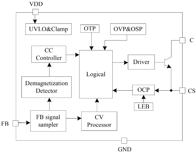 PL3368CE是一系列原邊控制,用于反激式開關電源的恒流/恒壓調節器。其高度集成了功率開關,并通過去除光耦以及次級控制電路,在簡化充電器/適配器等傳統的恒流/恒壓設計的同時實現了精確的電流和電壓調節,內部框架圖如下圖所示。