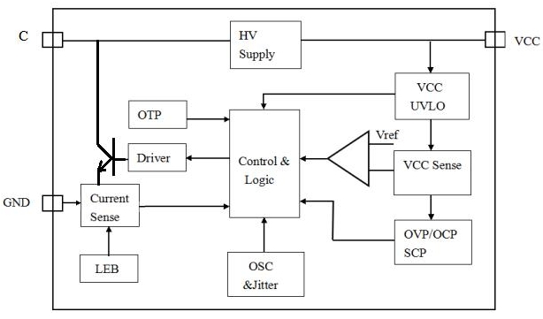 其內(nèi)部集成了650V功率開(kāi)關(guān),采用專(zhuān)利電壓電流控制技術(shù),無(wú)需外部電壓反饋和電流偵測(cè)電路即可實(shí)現(xiàn)精確的電壓和電流調(diào)節(jié),并可實(shí)現(xiàn)兩種輸出電壓選擇,極大的方便客戶(hù)使用。