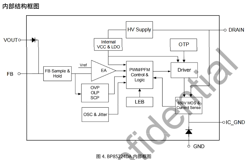 BP85224DA 是一款高性能、高集成度、低待機功耗的開關電源驅動芯片,適用于全電壓 85~265VAC 輸入的 Buck、Buck-Boost 變換器拓撲應用。 BP85224DA 內(nèi)部集成了 650V 高壓 MOSFET、高壓啟動和自供電電路、電流采樣電路、電壓反饋電路以及續(xù)流二極管,采用先進的控制技術,無需外部 VCC 電容和環(huán)路補償即可實現(xiàn)優(yōu)異的恒壓輸出特性,極大地減少了外圍器件數(shù)量,節(jié)省了系統(tǒng)成本和體積,同時提高了可靠性。
