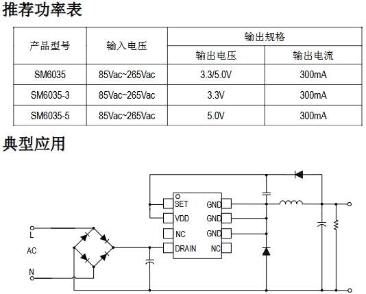 SM6035-X 是一款高精度非隔離、高集成度且低成本的降壓恒壓控制芯片,適用于 85Vac~265Vac 全電壓范圍應用;SM6035-X 內部集成500V高壓功率管,內置 CS 電阻,無需外部補償元件,即可實現(xiàn)優(yōu)異的線性調整率和負載調整率,外圍元件極少,大大的降低了系統(tǒng)的成本,節(jié)約了PCB的尺寸。SM6035-X 應用于多種供電電源領域,提供3.3/5V 兩種規(guī)格輸出電壓。同時芯片集成有完備的保護功能,過溫保護、過壓保護、欠壓保護等,保證了系統(tǒng)的可靠性。