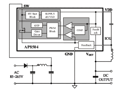 AP8505同樣基于高壓同步整流架構,集成PFM控制器以及500V高可靠性MOSFET,用于外圍元器件極精簡的小功率非隔離開關電源。AP8505的特點包括: