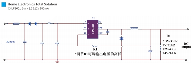 LP2601:適用于OR模式,輸出電壓可調(diào)的Buck降壓電路,推薦電壓為3.3V或5V,最大輸出電流可達(dá)100mA。這款芯片適合需要靈活電壓調(diào)節(jié)的應(yīng)用場(chǎng)景。