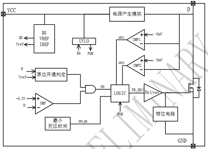 LP10R100S是由芯茂微電子推出的一款適用于AC-DC同步整流應用的芯片,特別適用于正激和反激系統。這款芯片支持多種工作模式,包括DCM(斷續導通模式)、BCM(邊界導通模式)、QR(準諧振模式)和CCM(連續導通模式)。LP10R100S內部框架圖如下: